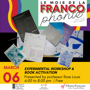 We are proud to host University of Xavier professor in Performance Studies, Ross Louis as he presents his project Performer l’imaginaire de la Nouvelle-Orléans. This artistic research project questions the social construction of a “French” New Orleans. Join us as we delve into this interesting contemporary social investigation of a topic relevant to our own home of New Orleans.