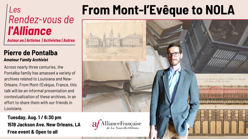 For any inquiries or further information, please contact us at marketing@af-neworleans.org. This event is organized by the Alliance Française de la Nouvelle-Orléans. We express our heartfelt gratitude to Pierre de Pontalba for sharing his passion for the family archives and allowing us to delve into this remarkable journey of history and heritage.