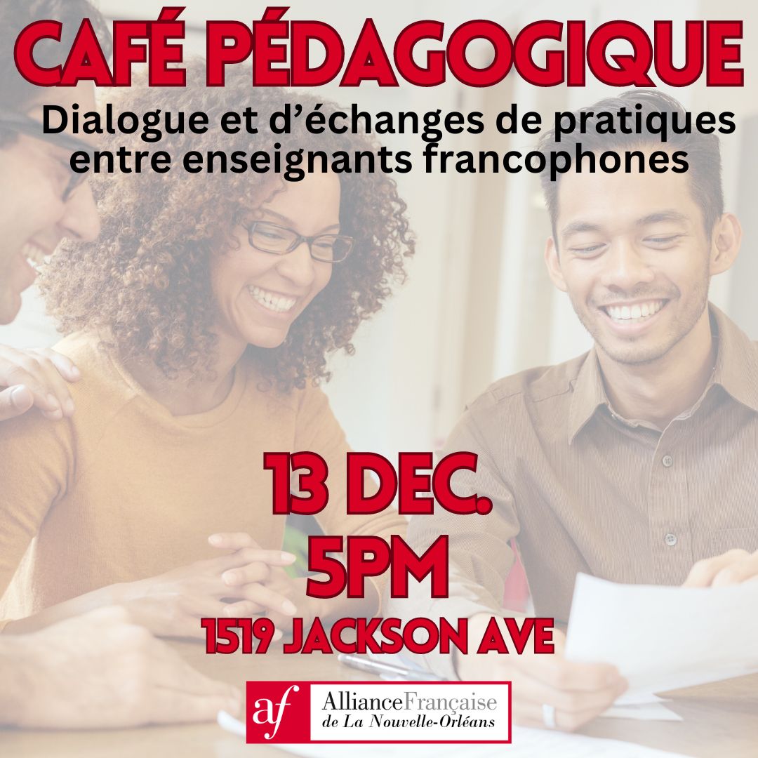 Pendant le Café pédagogique, nous encourageons les enseignants à partager leurs outils, leurs ressources et leurs stratégies d'enseignement réussies. Cet échange de connaissances enrichira non seulement les pratiques d'enseignement individuelles, mais contribuera également à l'amélioration globale de l'éducation en immersion française à La Nouvelle-Orléans.