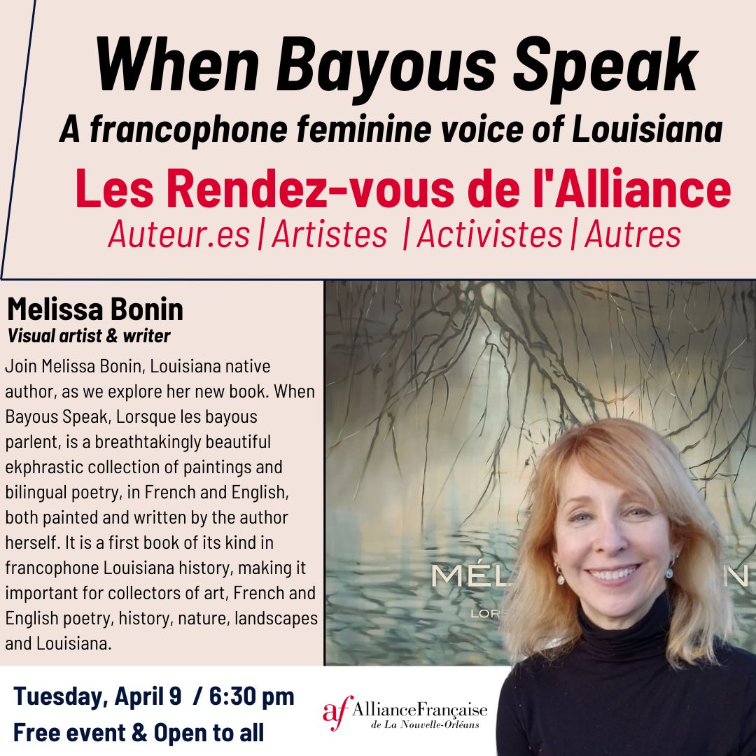 Embark on a poetic journey through the enchanting landscapes of Louisiana as we welcome Melissa Bonin to our Rendez-Vous Lecture series. Join us for an evening immersed in the magic of her latest creation, "When Bayous Speak, Lorsque les bayous parlent."