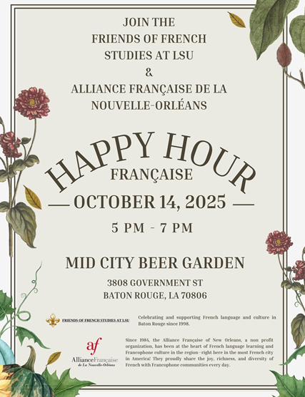 The Friends of French Studies at LSU and the Alliance Française de La Nouvelle-Orléans invite you to a festive evening celebrating French language and culture. Meet fellow francophiles, students, and community members while enjoying good company in a relaxed setting.
