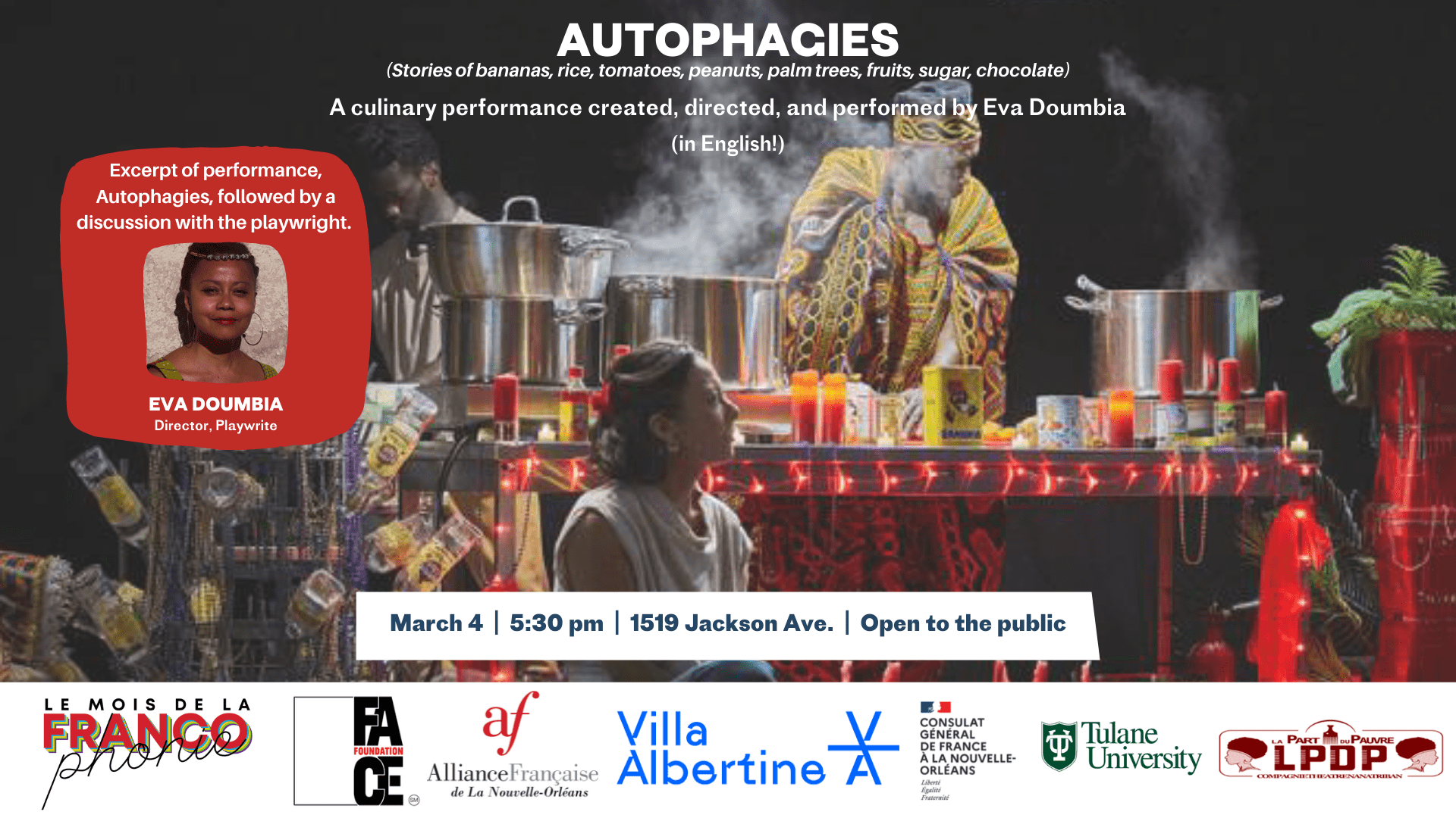The Alliance Française of New Orleans is hosting playwright and director Eva Doumbia for a musical reading of an excerpt from her play Autophagies, which will be followed by a Q&A. This event is organized in partnership with Villa Albertine, the Consulate General of France in Louisiana, the Face Foundation, and Tulane University.