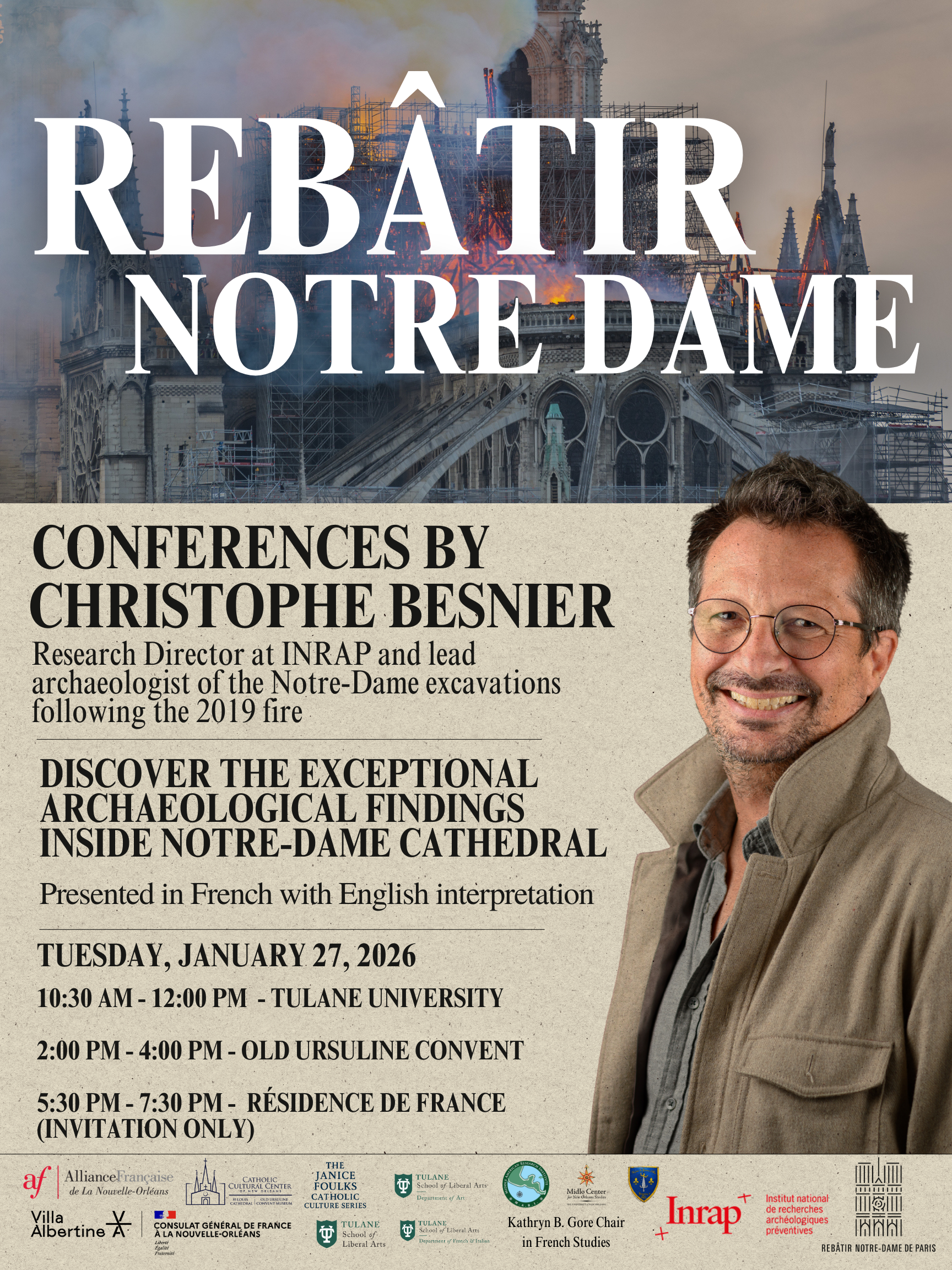 Nous tenons à remercier les partenaires suivants pour leur soutien à cette tournée de conférences : Villa Albertine, Consulat général de France en Louisiane, The Catholic Cultural Center of New Orleans, The Janice Foulks Catholic Culture Series, Tulane University School of Liberal Arts, Tulane University Department of French and Italian, Tulane University Department of Art, Tulane University Middle American Research Institute, Katherine B. Gore Chair in French Studies de Tulane University, Krewe de Jeanne d’Arc, The Ethel and Herman L. Midlo Center for New Orleans Studies, Institut National de Recherches Archéologiques Préventives, Rebâtir Notre‑Dame de Paris.