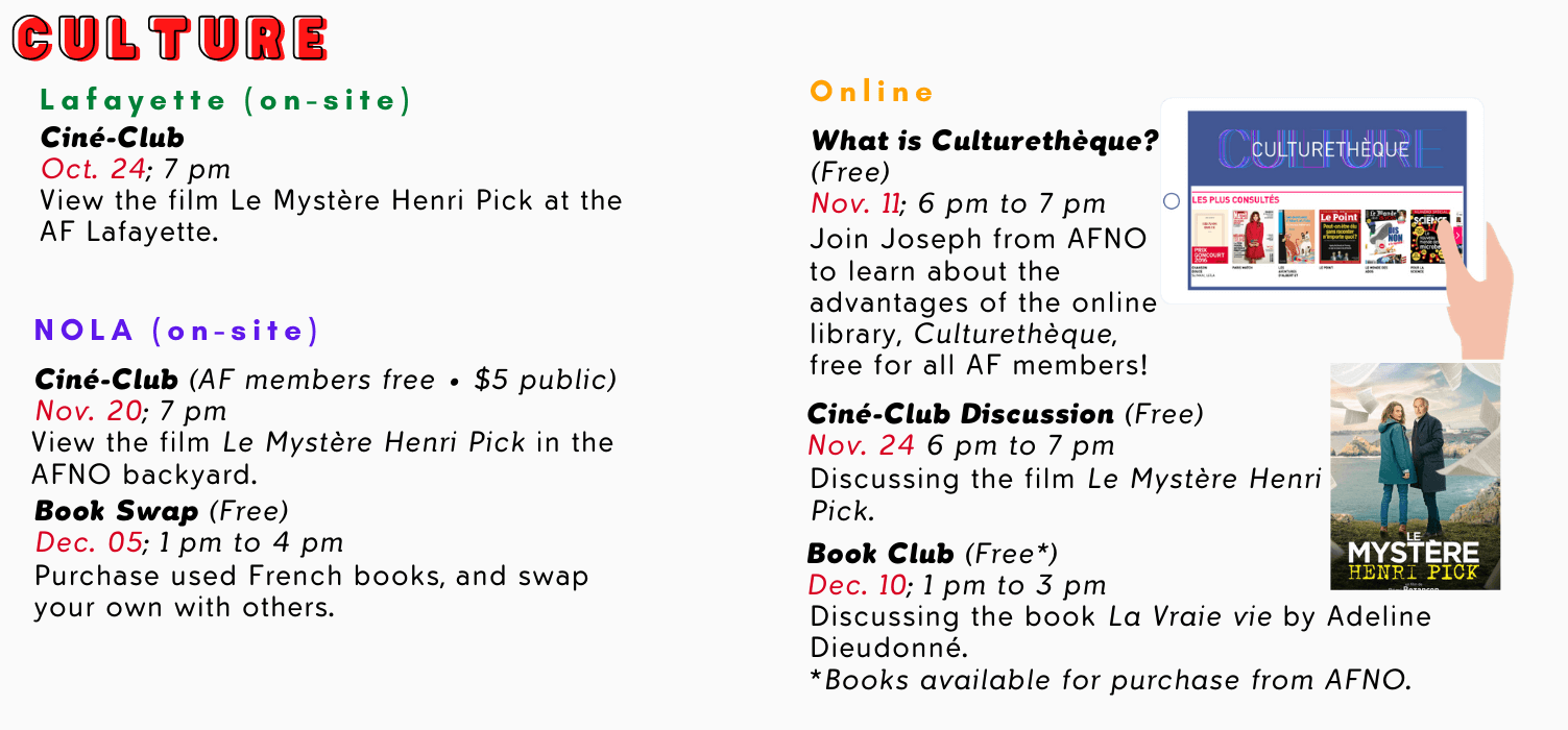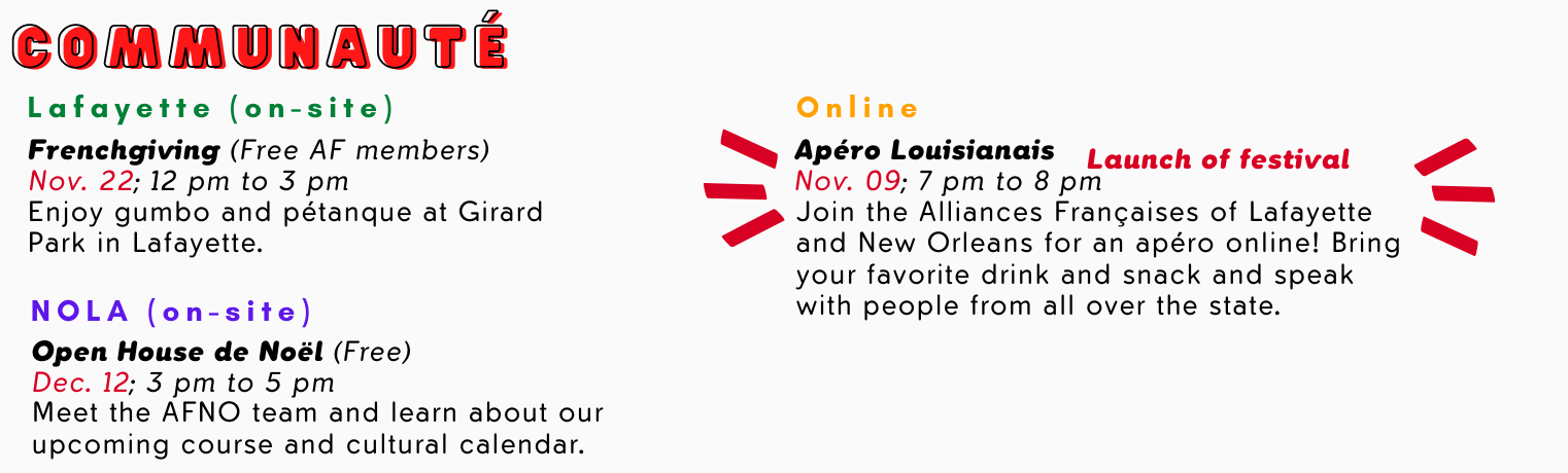 Louisiana is the most Francophone of the United States and the two Alliance Française chapters in Louisiana lead numerous initiatives aimed at the education of French and the promotion of the cultural diversity of the Francophone world. This first edition of the Festival des Alliances Françaises de Louisiane will allow the French and Francophone communities of New Orleans and Lafayette to come together around cultural and community events. There is something for everyone--for cinephiles as well as fans of literature, for food lovers, as well as DIY enthusiasts, for adults and children, face-to-face (safely) and online, in New Orleans as well as in Lafayette! Nous espérons vous voir !