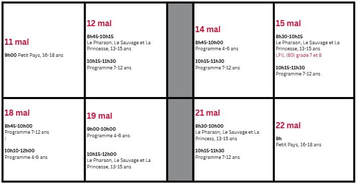 · Dates des projections : 11, 12, 14, 15, 18, 19, 21 et 22 mai entre 8h30 et 11h30