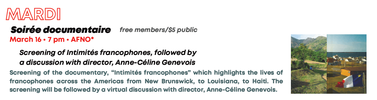 la projection du film documentaire Intimités francophones, suivi d’une discussion avec sa réalisatrice, la franco-québécoise, Anne-Céline