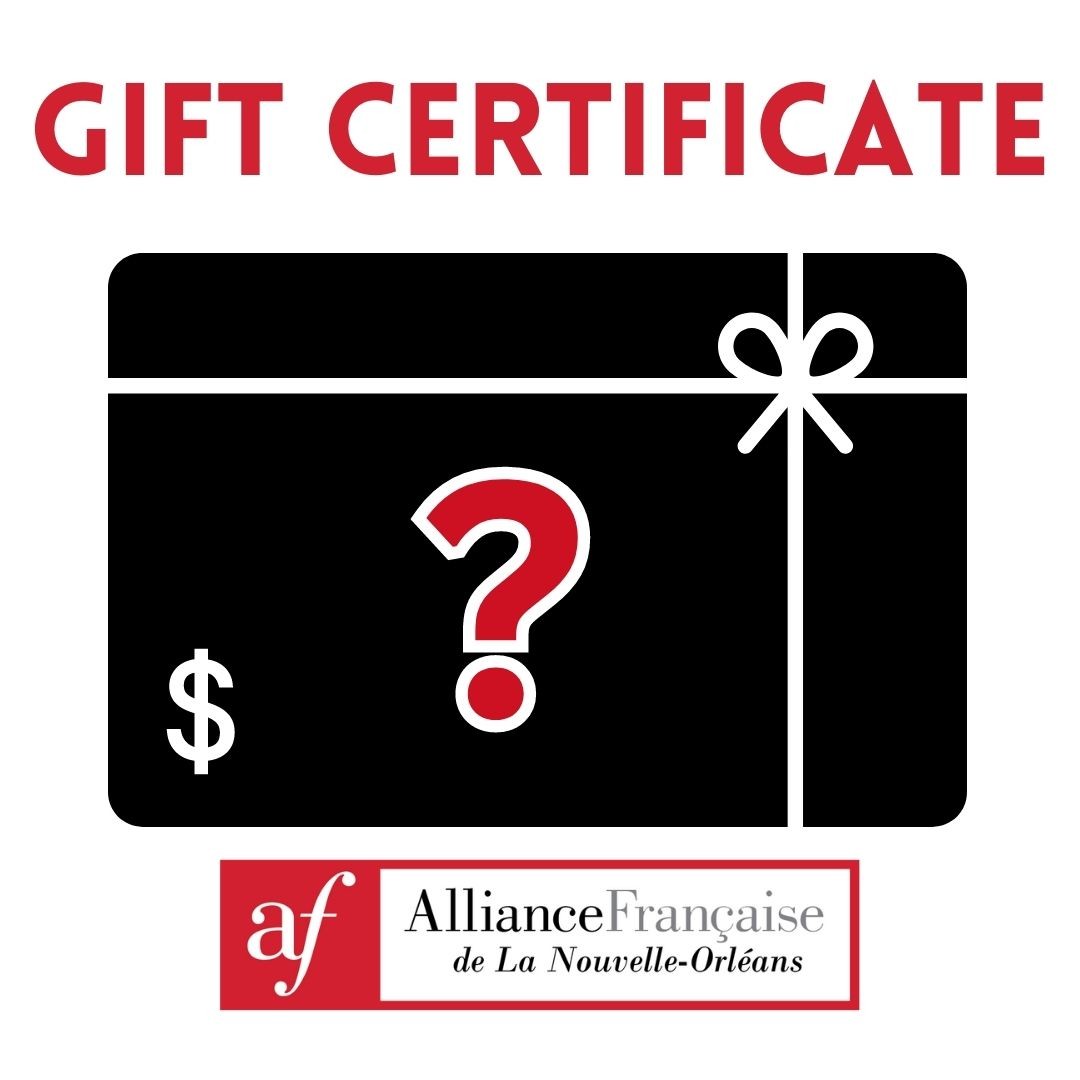 with an Alliance Française gift certificate, redeamable for memberships, classes, or cultural events!