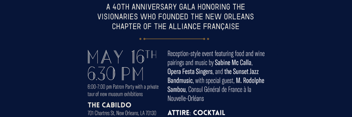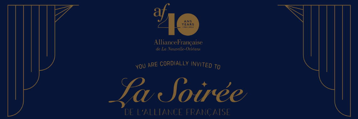 You are cordially invited to La Soirée de l'Alliance Française, a gala dedicated to honoring the visionaries who laid the foundation for the Alliance Française de la Nouvelle-Orléans in 1984. Join us in celebrating 40 years of promoting French culture, fostering community growth, and embracing diversity.